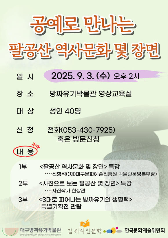 (재)대구문화예술진흥원 박물관운영본부 소속 대구방짜유기박물관은 9월 3일(수) 오후 2시에 팔공산국립공원의 풍경과 역사문화, 방짜유기 아름다움 등을 살펴보는 ‘공예로 만나는 팔공산 역사문화 몇 장면’을 개최한다.