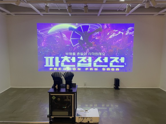 입구에 들어서면 정면 끝에 배준형 작가의 ‘파천접선전’이 눈에 띈다. 이 작품은 관객이 직접 참여하는 게임 형식으로, 참가자는 부채 모양 컨트롤러를 손에 끼고 빔프로젝터로 비친 화면을 보며 게임을 진행한다.