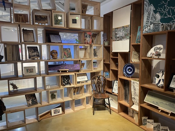 ‘인궤도’가 인간 삶의 궤적을 선 형태로 담았다면, 권인경 작가의 ‘열린 방 2025’는 방이라는 개인적 공간에 스며든 거주자의 흔적에 집중한다. 책장으로 둘러싸인 공간 안에 의자가 놓인 설치 작품으로, 군데군데 비어있는 책장 틈새와 문이 없는 구조로 인해 방 안에서 밖을 바라볼 수 있고, 밖에서도 안을 들여다볼 수 있다.