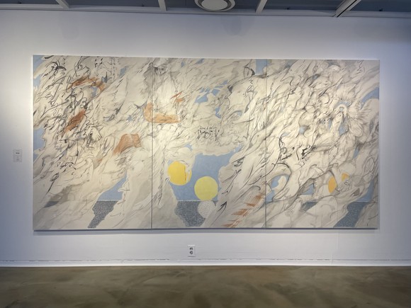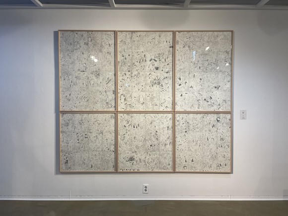 바로 왼쪽에는 박경 작가의 ‘인궤도’가 벽면 한쪽을 큼직하게 차지하고 있다. 접선의 의미를 사람들의 흔적에 대한 기록으로 재해석한 작품으로, 수많은 선과 그 선들로 이뤄진 원들이 등장한다.