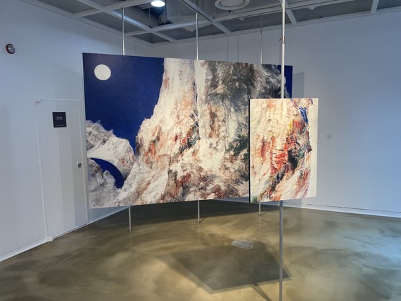 바로 옆에는 박준석 작가의 연작 ‘고요한 무지’가 시선을 끈다. 두 점의 회화로 구성된 이 작품에서 작가는 캔버스에 암벽의 단면을 담았고, 인공지능이 이를 학습해 재구성한 이미지를 대형 캔버스에 출력한 뒤 붓으로 보완해 완성했다.