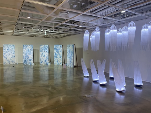 그 옆에는 노해율 작가의 ‘Movable’이 자리한다. 제목에서 드러나듯 이 작품은 움직임을 예술에 담은 키네틱 아트로, 천장과 바닥에 설치된 30개의 오브제가 반투명 재료와 내부 전구로 구성돼 좌우로 움직인다.