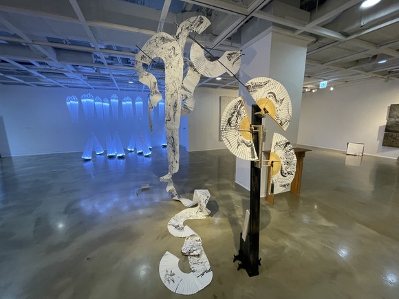 뒤를 돌면 멸종위기 조류인 도요새 이미지가 종이 위에 수직으로 이어진 츄리 작가의 ‘날개짓’이 눈에 들어온다. 김동식 부채장인과 협업해 콜라보레이션 수상작으로 선정된 이 작품은 작가가 충남야생동물구조센터에서 관찰한 도요새의 삶과 죽음, 그 경계의 흔적을 담았다.