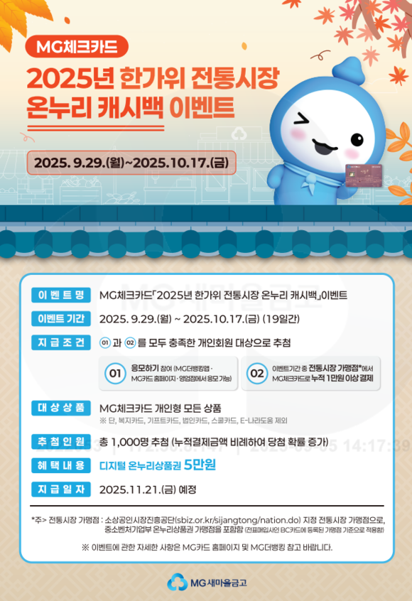 이번 이벤트는 응모 후 MG체크카드 개인형 상품으로 전통시장 가맹점에서 누적 1만원 이상 결제한 회원을 대상으로 하며, 총 1,000명을 추첨해 디지털 온누리상품권 5만원을 제공한다. 전통시장 가맹점은 소상공인시장진흥공단 지정 전통시장과 중소벤처기업부 온누리상품권 가맹점이 포함된다.