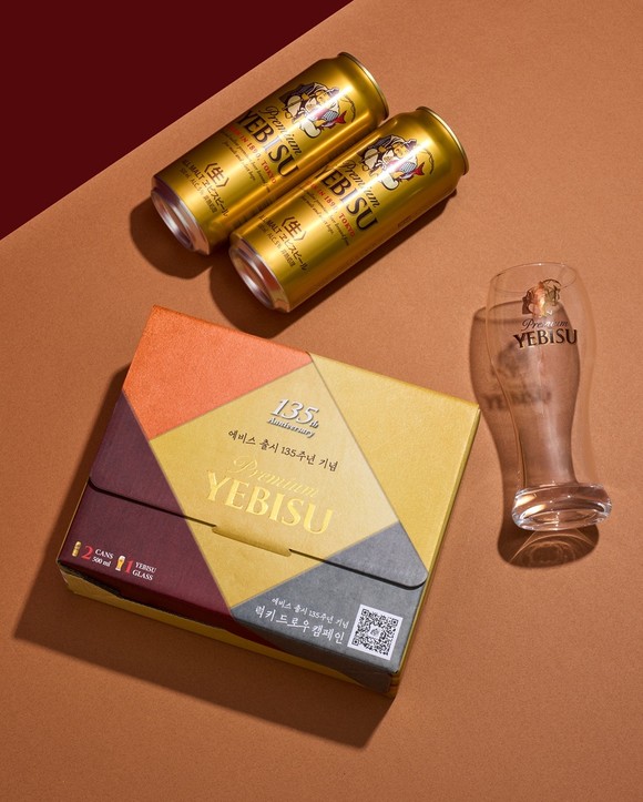 이번 기획 팩은 에비스(500㎖) 두 캔과 전용 잔, 그리고 135주년을 기념하는 로고 스티커(랜덤)로 구성했다.