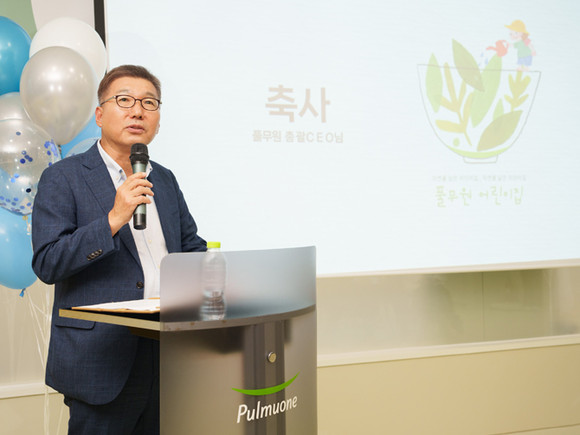 1일 풀무원 수서 본사 어린이집에서 열린 ‘풀무원어린이집 증축식’에서 풀무원 이우봉 총괄CEO(사진)가 증축 개원을 축하하는 메시지를 참석자들에게 전하고 있다. 사진=풀무원