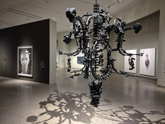 전시의 제목으로 활용된 아이 웨이웨이의 ‘검은 샹들리에’는 빛을 내지 않는다. 오히려 빛을 흡수하는 검은색으로 제작되어 있고 자세히 보면 사람의 두 개의 골이라든지 장기들, 척추 뼈들이 하나로 이루어져 샹들리에의 모양을 만들어낸다. 그리고 검열의 상징으로 많이 사용하는 꽃게의 이미지도 작품에 포함되어 있다. 작가는 이 작품을 통해 불안한 미래를 표현하고 있다.
