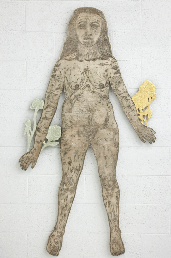 키키스미스의 코르사주에서 코르사주는 프랑스어로 여성의 상반신을 의미하기도 하고, 일반적으로 아는 여성의 몸을 옥죄는 코르셋이라는 의상의 어원이기도 하다 그런데 작가는 이 작품에서 양손에 화사한 꽃을 들고 있는 나이 든 노년의 여성의 모습을 표현을 하고 있다. 주름진 얼굴과 처진 가슴, 튀어나온 배 이런 것들이 드러나고 있는데 그럼에도 불구하고 여성의 표정은 고정 관념에서 탈피해 굉장히 편안해 보이고 자유롭고 당당해 보인다.