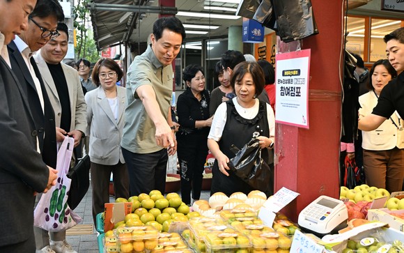 오 시장은 과일과 한과 등을 온누리상품권으로 직접 구매하고 상인들의 현장 목소리를 청취하고 격려했다. 또 제수용품 구매를 위해 전통시장을 방문한 시민들과 명절인사도 나눴다.