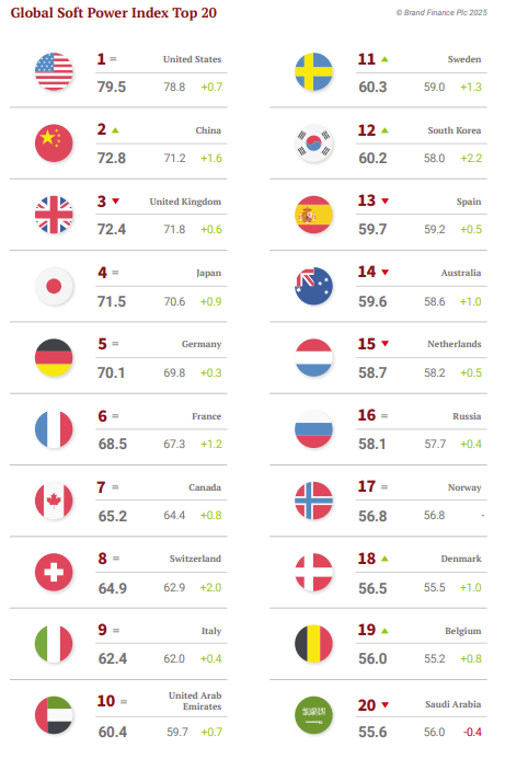 ‘글로벌 소프트 파워 인덱스 2025’의 소프트파워 상위 20개국 순위. 자료=브랜드 파이낸스
