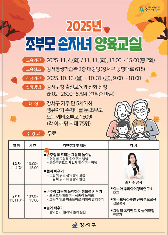 신청 대상은 강서구에 거주하는 만 5세 이하의 손자녀를 둔, 조부모나 예비 조부모다. 신청은 오는 10월 31일까지 가능하다. 회차별 75명씩 총 150명을 선착순 모집하며, 조기 마감될 수 있다. 수강료는 무료다.