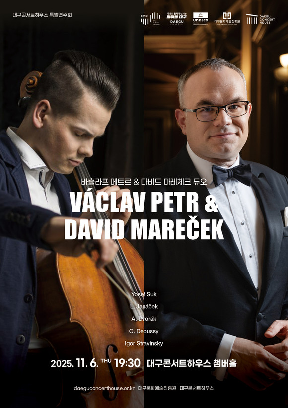 유럽을 대표하는 명문 악단인 체코 필하모닉 오케스트라의 두 주역이 대구 무대에 오른다. 오는 11월 6일 (목) 오후 7시 30분, 대구콘서트하우스 챔버홀에서 열리는 <바츨레프 페트르 & 다비드 마레체크 듀오> 리사이틀은 체코 낭만의 서정과 20세기 유럽 모더니즘의 세련된 감각을 담았다.