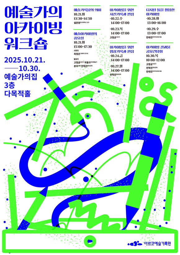 한국문화예술위원회(위원장 정병국) 아르코예술기록원(이하 예술기록원)은 오는 10월 21일(화)부터 10월 30일(목)까지 대학로 예술가의집 3층 다목적홀에서 신진예술가를 대상으로《예술가의 아카이빙 워크숍》을 운영한다.