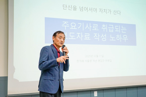 이날 강의는 한겨레신문 ‘서울&’ 섹션 편집장 하변길 기자가 맡아 ‘단신을 넘어서야 자치가 산다’를 주제로 2시간 동안 진행됐다. 하 기자는 보도자료의 기사화 가치와 기획력, 기자들이 주목하는 자료 구성, 제목과 리드문 작성 요령, 사진·캡션 작성 실무 등을 구체적인 사례를 통해 설명했다.