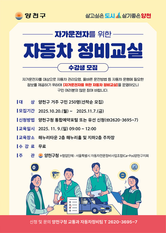 정비교실 참가 신청은 선착순 250명을 대상으로 10월 20일부터 11월 7일까지 진행되며, 참여를 원하는 주민은 누구나 양천구청 홈페이지 통합예약포털에서 신청하거나 교통과로 전화 접수하면 된다.