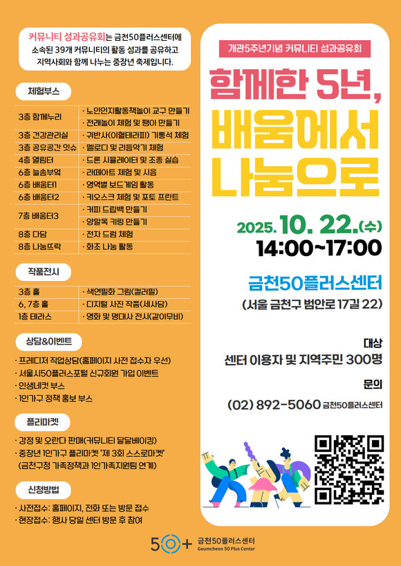 이번 행사는 금천50플러스센터 이용자와 주민 누구나 참여 가능하다. 관심 있는 주민은 사전에 금천50플러스센터 누리집 및 전화, 방문을 통해 신청하거나 행사 당일 현장 접수를 통해 참여할 수 있다.