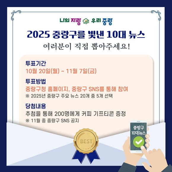 서울 중랑구(구청장 류경기)는 2025년 한 해를 빛낸 대표 정책과 사업을 구민이 직접 선정하는 ‘2025 중랑구를 빛낸 10대 뉴스’ 온라인 주민 투표를 10월 20일(월)부터 11월 7일(금)까지 실시한다.