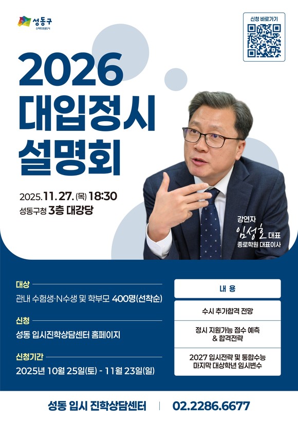 서울 성동구(구청장 정원오)는 오는 11월 27일 오후 6시 30분 성동구청 3층 대강당에서 ‘2026학년도 대입 정시 설명회’를 개최한다고 밝혔다.