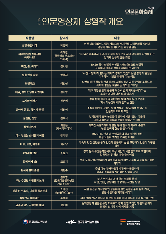 영상제를 개최한 아르코 관계자는 “이번 인문영상제는 각 지역의 인문적 의미를 깊이 있게 담아낸 다양한 작품을 선보이는 자리”라며, “<2025 인문영상제>에 많은 관심과 참여를 바란다.”고 말했다.