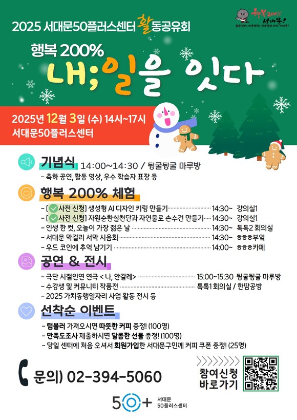 서울 서대문구(구청장 이성헌)는 중장년의 성공적인 인생 2모작을 지원하는 서대문50플러스센터(센터장 변재준)가 12월 3일 오후 2시부터 5시까지 센터 곳곳에서 지역주민과 한 해 성과를 공유하는 ‘2025 행복200% 내;일을 잇다’를 개최한다고 밝혔다.
