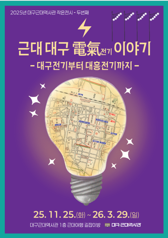 (재)대구문화예술진흥원 박물관운영본부(본부장 신형석) 소속 대구근대역사관은 전기(電氣)로 근대 대구사회의 일면을 살펴보는 <근대 대구 電氣전기 이야기 –대구전기부터 대흥전기까지-> 작은전시를 11월 25일(화)부터 2026년 3월 29일(일)까지 1층 대구 근대여행 길잡이방에서 개최한다.