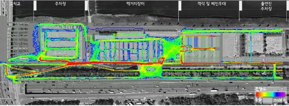 '안양천 축제 구간'을 대상으로 실시한 다중인파 안전관리 시뮬레이션 결과를 시각화한 모습. 공간 사용패턴, 보행 밀집도가 색상별로 표시돼 있어 인파 흐름과 위험 지역을 예측할 수 있다. 사진=구로구청