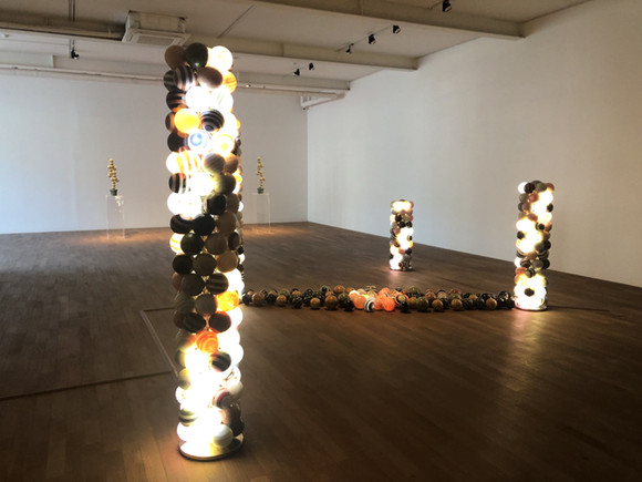 알록달록 여러 색상의 빛을 밝히는 구슬들의 모습이 신비롭다. 천장에서 빛처럼 쏟아져 내려오는 듯한 구슬들도 눈길을 끈다. 반대로 다른 한켠에선 반대로 바닥에서부터 천장을 뚫을 듯 솟아오른 묵직한 기둥의 존재감이 상당하다. 모두 박은선 작가의 손에서 탄생한 조각 작품들의 모습이다.