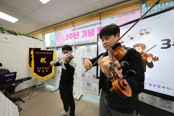 마포 발달장애인 문화창작소 3주년을 기념한 듀엣 바이올린 축하공연. 사진=마포구청