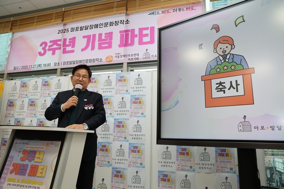 박강수 서울 마포구청장은 11월 27일 오후 4시, ‘마포 발달장애인 문화창작소(양화로 178-5)’ 개관 3주년 기념 파티에 참석해 이용인·가족·운영 관계자들과 따뜻한 축하의 시간을 가졌다.
