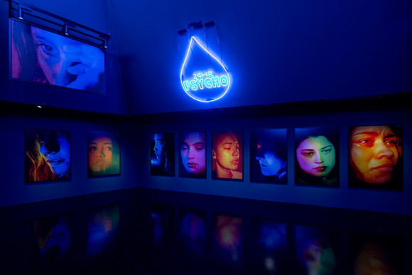 ‘24시간 사이코(24hr Psycho)’(2015~2016) 시리즈는 감정적 고통을 겪고 있는 열 명의 여성 얼굴을 대형 클로즈업으로 찍은 작업이다. 어머니의 양극성 장애를 지켜보며 자란 작가는 이 감정이 표출돼야 한다는 메시지를 전달한다. ‘나 지금 너무 우울해’, ‘내가 너무 싫어’와 같은 자기비하를 담은 네온 사인의 문장은 가볍고 쉽게 부서지는 네온사인 특유의 물성을 통해 인물들의 상태와 감정이 드러날 때를 시각화한다.
