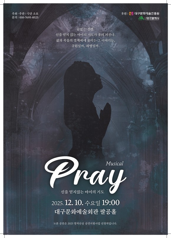 12월 10일(수)에 무대에 오르는 소묘(아트컴퍼니 소묘)의 ‘PRAY(프레이)' -신을 믿지 않는 아이의 기도’는 이스라엘·팔레스타인 분쟁을 모티브로 하여 희생·용서·구원의 메시지를 담아낸 창작 뮤지컬이다. 극작과 연출을 백창하 대표가 맡았으며, 작곡과 음악은 김성경·정민지 감독이 함께했고 안무는 김채린 감독이 맡아 화려하면서도 섬세한 무대 연출과 웅장하고 아름다운 음악으로 극의 감정선을 깊이 있게 전달하며 관객에게 강렬한 몰입과 여운을 선사할 예정이다.