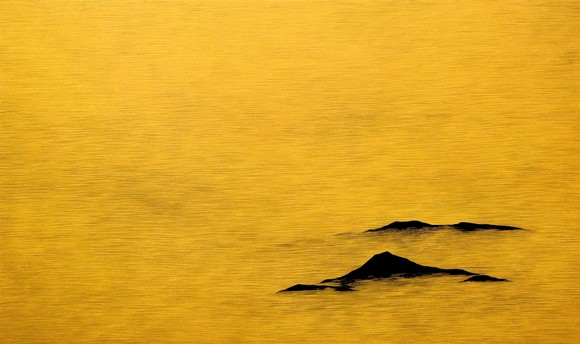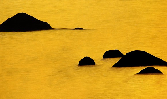 이번 전시의 주요 작품인 ‘스미는 고요’는 금빛 물을 그린 듯 보이지만 사실은 검은 물과 검은 섬의 세계를 품고 있다. 김조은 작가에게 상처는 단순한 어둠이 아니라 존재를 증명하는 무게이며, 시간이 켜켜이 남긴 흔적이다. 검은 물결은 어느 순간 산이 되고, 바위가 되고, 다시 섬이 되어 화면에 단단하게 자리한다. 작가는 황금빛과 검은 색의 대비 속에서 삶의 모순과 조화를 이야기하며, 상처와 빛 모두가 한 사람의 삶을 완성한다고 말한다. 작가의 풍경은 결국 “당신의 상처는 굳건함과 깊이를 보여주며, 그렇기에 당신은 빛나는 존재”라고 조용히 속삭이는 위로의 형식이다.