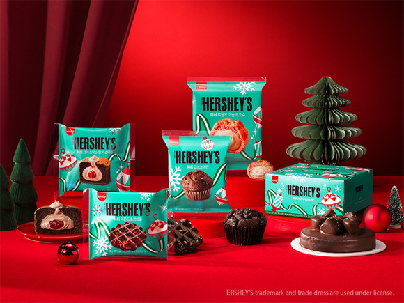 SPC삼립은 허쉬의 초콜릿 풍미를 살린 베이커리·상온케익·디저트 등 제품을 선보였다. 크리스마스 분위기에 어울리는 디자인 요소를 패키지에 적용했다.