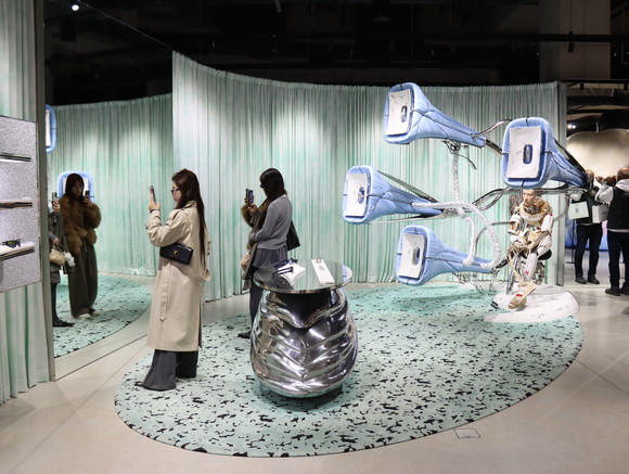 젠틀몬스터의 제품 배치 구도에 담긴 시각 전략은 일반적인 리테일 방식과도 정반대다. 보통 매장은 제품을 가장 잘 보이게 중심에 두지만, 젠틀몬스터는 거대한 설치물 속에 제품을 배치해 ‘비중심적 구도’를 만든다. 이러한 젠틀몬스터의 공간은 대비·구도·주의 분산이라는 프레임워크를 기존 시각 전략과는 반대로 적용하며 소비자의 시선을 브랜드 스토리로 이동시켰다.