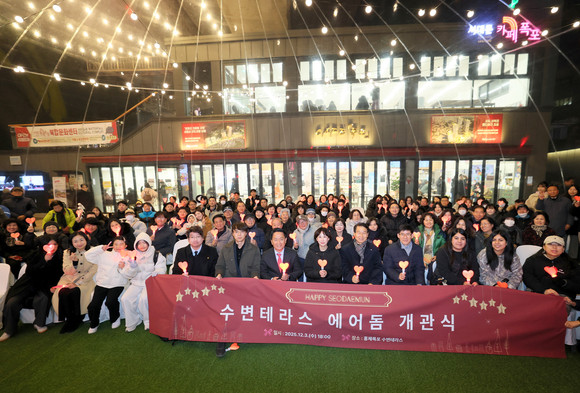 서울 서대문구(구청장 이성헌)는 홍제폭포 일대의 겨울 야경을 더욱 아름답게 밝히고 방문객에게 따뜻함을 전하기 위해 최근 카페폭포 앞 수변테라스에서 ‘2025년 홍제폭포 에어돔 개관식’을 개최했다고 8일 밝혔다.