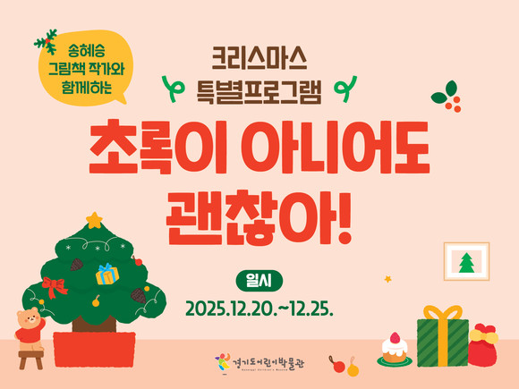 경기문화재단 경기도어린이박물관(관장 박균수)은 2025년 12월 20일(토)부터 12월 25일(목)까지 크리스마스 특별프로그램 〈초록이 아니어도 괜찮아!〉를 운영한다.