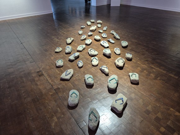 암둘라 알 사아디의 '스톤 슬리퍼'는 슬리퍼 밑창을 닮은 돌을 모아 발가락 고리를 덧붙여, 가상의 유목민들이 세계를 떠돌며 끝내 찾지 못할지도 모를 무언가를 찾아 걸어갈 수 있도록 가볍고 시적인 효과를 더했다.