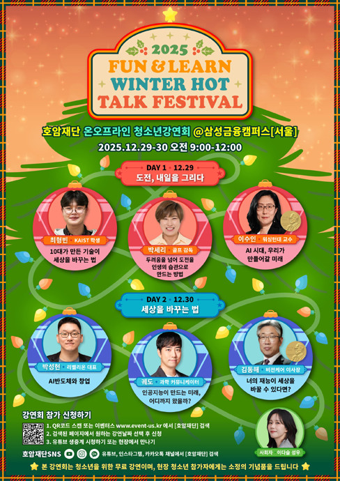 호암재단(이사장 김황식)이 청소년 특화 강연 프로그램인 ‘펀앤런, 2025 윈터 핫 톡 페스티벌’을 연다고 17일 밝혔다. 페스티벌은 29~30일 서울 서초구 삼성금융캠퍼스에서 현장 및 온라인 참여 방식으로 진행한다. 전문가들의 지식과 경험을 미래세대와 공유하기 위한 지식 나눔의 장이다.