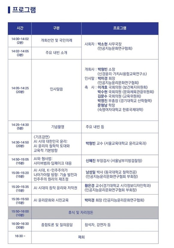 행사는 더불어민주당 이개호·박수현·김문수 국회의원이 공동 주최하고, 신경윤리·가치AI융합교육연구소와 인공지능윤리문화연구협회가 주관한다.