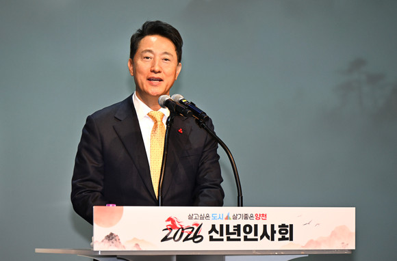 오후 2시 양천문화회관 대극장(양천구 목동서로 367)을 찾은 오 시장은 “2026년은 지난해 첫삽을 뜬 대장~홍대광역철도 ’대장홍대선‘, ’서부트럭터미널‘ 부지개발 등이 본격적으로 속도를 내는 뜻깊은 해가 될 것”이라며 “특히 서남권 대표 주거단지 ’목동아파트‘는 약 4만 8천 가구에 달하는 신도시급 변모를 앞두고 있는데, 무려 2만 가구가 늘어나 서울의 주택공급에 숨통이 트일 것”이라고 말했다.