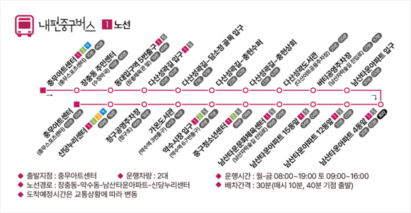 내편중구버스는 기존에는 평일 오전 8시부터 오후 7시까지, 토요일 오전 10시부터 오후 4시까지 운행했으나, 파업 기간 평일에는 오전 7시부터 오후 8시까지, 2시간 연장 운행한다. 시민들의 출·퇴근 시간에 맞춰 이동 불편을 줄이기 위해서다. 토요일은 기존대로 운행한다.