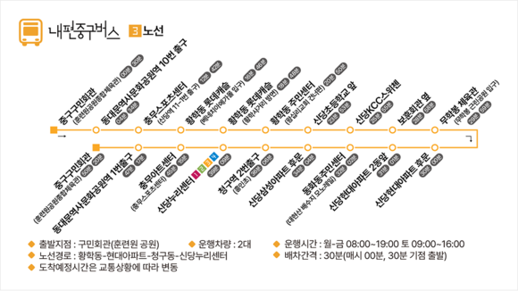 '내편중구버스'는 중구 전역을 아우르는 총 8개 노선으로 운행한다. △1·2·3노선은 '신당권 순환' △4·5·6노선은 '신당권–중구청–서부권 연결' △7·8노선은 '서부권 순환' 노선이다.