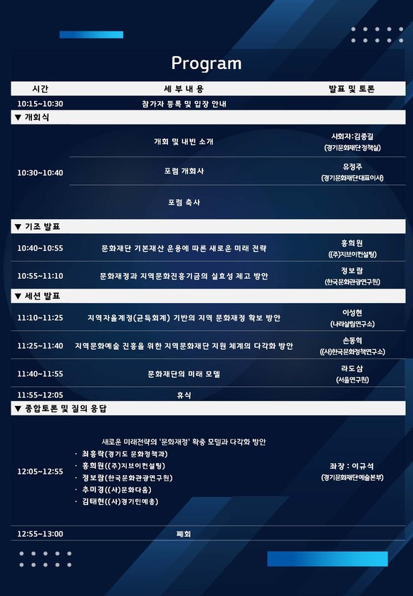 이어지는 세션발표에서는 재원구조 변화 속에서 지역 문화재정을 어떻게 넓힐 것인지, 지역문화재단이 어떤 방식으로 공공 재원과 민간 자원을 결합해 지속가능한 생태계를 만들지에 대한 구체적 논의가 진행된다.