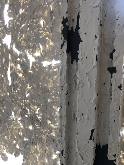 최선아 작가의 ‘진지바’는 스컬피를 건물 외벽에 붙인 작품이다. 멀리서 봤을 땐 하얀 페인트 덩어리 같지만, 작품 가까이 다가갈수록 다른 느낌을 받는다. 최 작가는 손가락으로 눌러 형태를 변형시킬 수 있는 소조 재료인 스컬피를 사용해 14m에 달하는 로비 공간 구조에 덧입혔다. 그래서 손가락 힘의 흔적들이 결과물에 자연스레 남아 있다. 꼭 창이라는 캔버스에 손가락이라는 붓을 통해 스컬피로 그림을 그린 것 같기도 하다. 전시장을 찾은 날은 매우 추웠던 날이라 꼭 창에 눈이 내린 것처럼 보이기도 했다. 해가 뜨고 질 때 생기는 그림자로 인해 아침과 점심, 저녁마다 모두 다른 모습을 보여주는 작품이기도 하다.