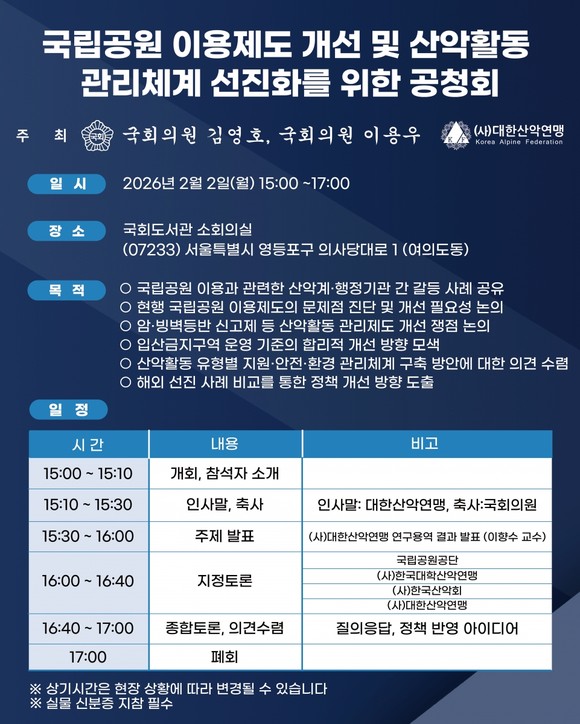 대한산악연맹(회장 조좌진)은 국회의원 김영호, 국회의원 이용우와 공동으로 오는 2월 2일(월) 오후 3시, 국회도서관 소회의실에서 '국립공원 이용제도 개선 및 산악활동 관리체계 선진화를 위한 공청회'를 개최한다.