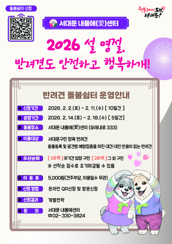 서울 서대문구(구청장 이성헌)가 설 연휴 기간 반려견 돌봄에 어려움이 있는 구민들을 위해 이달 14일 토요일부터 18일 수요일까지 닷새간 서대문 내품애(愛)센터(모래내로 333)에서 반려견 돌봄 쉼터를 운영한다.