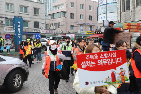 송파구는 지난 2월 4일 풍납전통시장에서 송파소방서, 의용소방대, 풍납1동 직능단체 등과 함께 민·관 합동 화재예방 캠페인을 진행했다. 이날 행사에는 관계기관 및 지역 단체 등 40여 명이 참여했다.