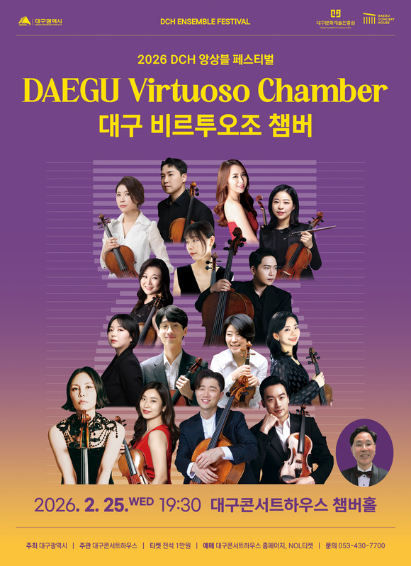 (재)대구문화예술진흥원 대구콘서트하우스(관장 박창근)는 실내악의 다양한 편성과 음악적 깊이를 집중 조명하는 ‘2026 DCH 앙상블 페스티벌’을 개최한다. 이번 축제는 국내외 정상급 연주자들과 지역 기반 앙상블이 함께하는 무대로, 관객들이 보다 가까운 거리에서 실내악 고유의 섬세한 호흡과 밀도 높은 사운드를 만날 수 있도록 기획됐다. 축제의 일환으로 <대구 비르투오조 챔버>의 공연을 2월 25일(수) 오후 7시 30분 챔버홀에서 개최하며, 현악 앙상블 레퍼토리의 정수를 선보인다.