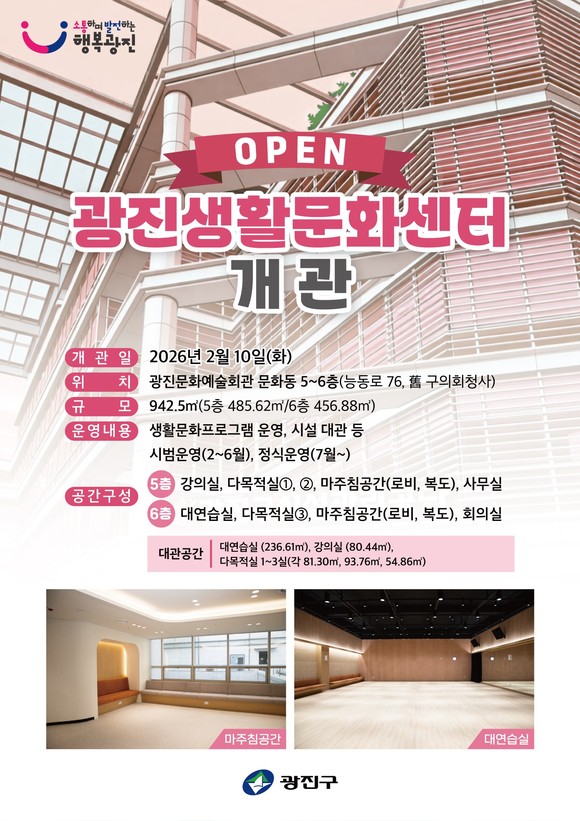 김경호 광진구청장은 “광진생활문화센터는 주민이 일상에서 문화예술을 배우고 즐기며 서로 소통할 수 있는 참여형 복합 문화 공간”이라며, “앞으로도 공간 운영과 프로그램을 지속적으로 보완해 지역 문화의 저변을 넓히는 거점으로 발전시켜 나가겠다”고 말했다.