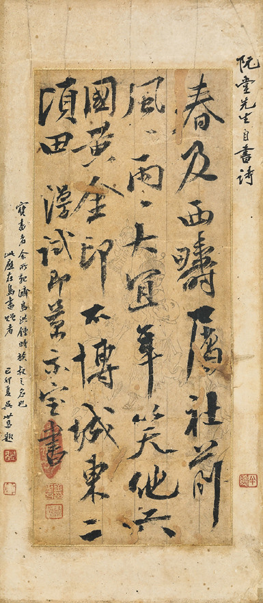 이 시를 통해 김정희는 두 이랑의 밭을 전국시대 황금 인장과도 바꿀 수 없다며 한층 봄물이 오른 자연을 예찬했다. 글의 막바지에는 홍보서에게 써준다는 글귀와 함께 ‘김정희인’과 ‘완당’이라는 도장을 남겼다. 이어 작품과는 별개로 표구 부분에는 오세창의 배관이 전해 홍보서의 조카뻘 되는 홍종시라는 인물이 위창과 가까운 지인으로, 선대부터 보관해 오던 이 글씨를 들고 와 감식을 부탁했음을 알 수 있다.
